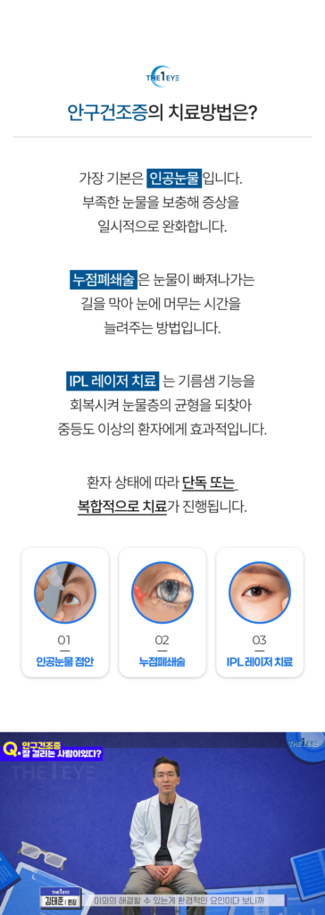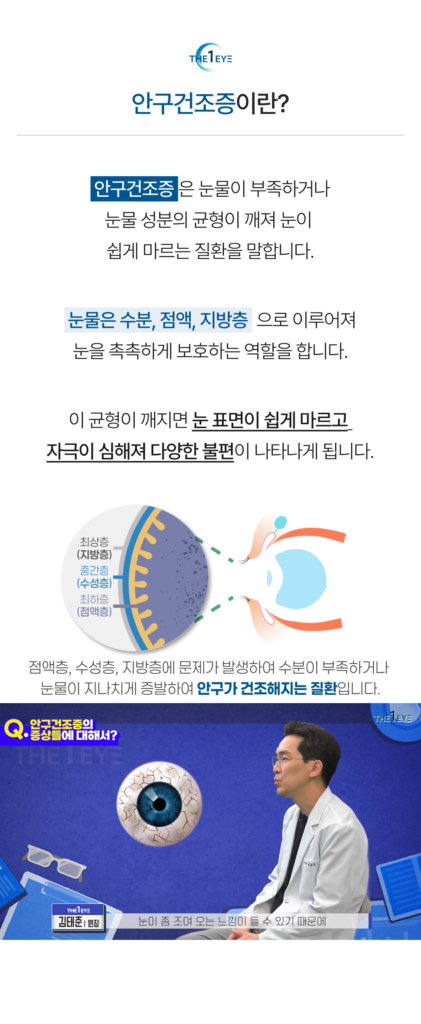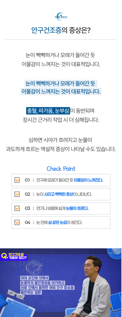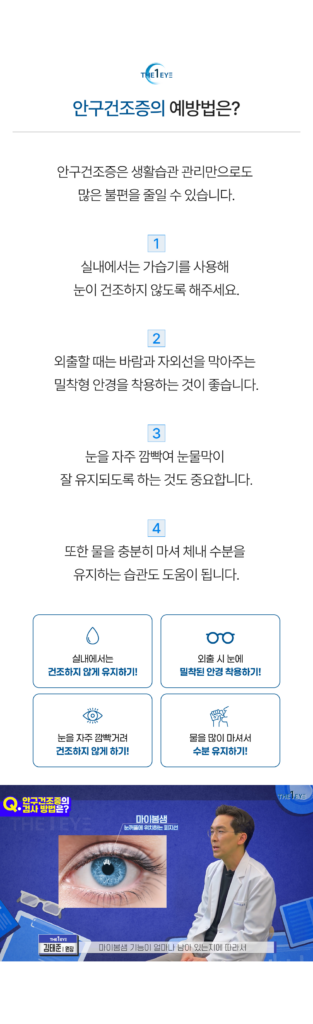 - 건조한 실내 환경: 에어컨이나 난방기 사용으로 습도가 낮아지면 눈의 수분이 빠르게 사라집니다.
